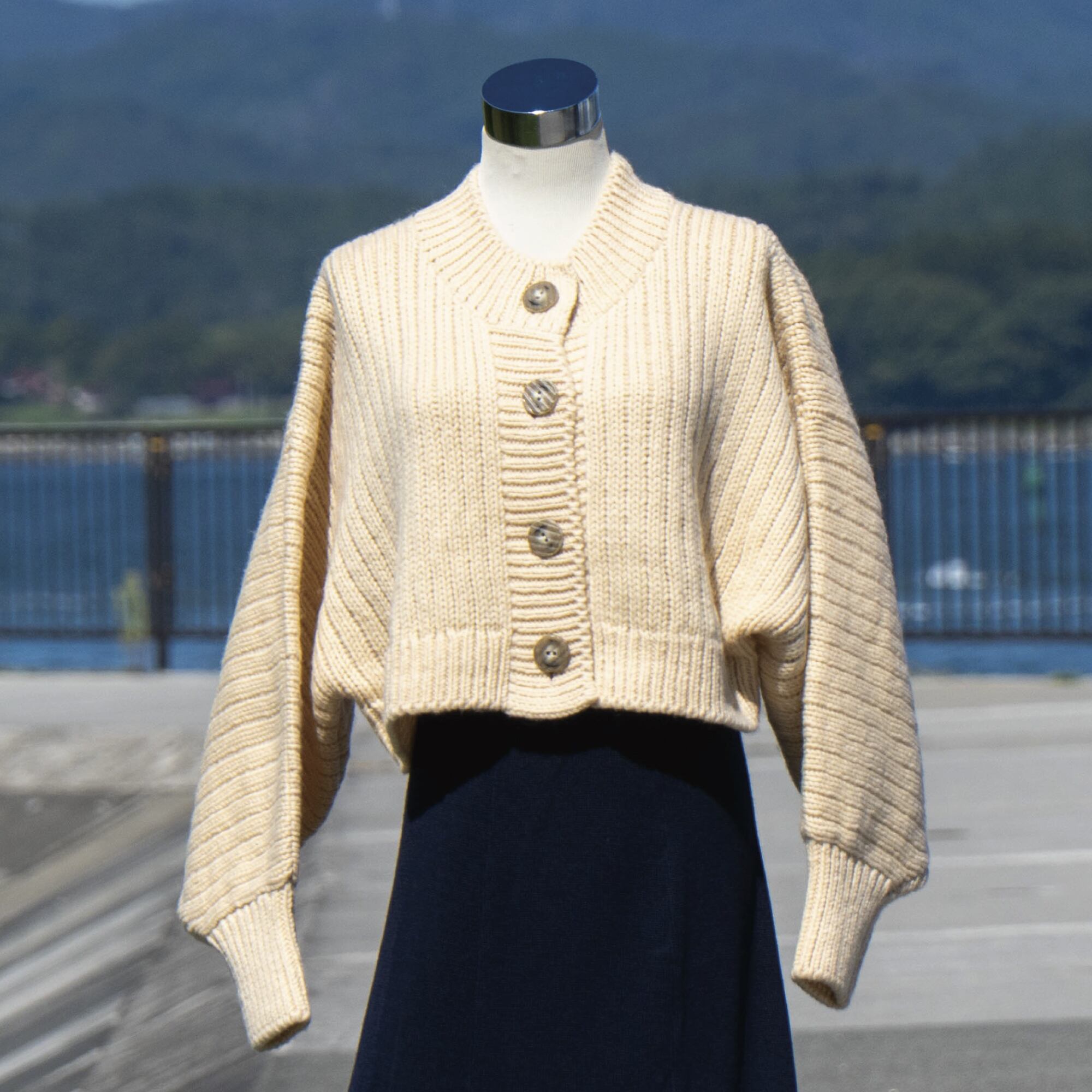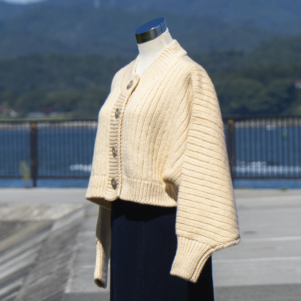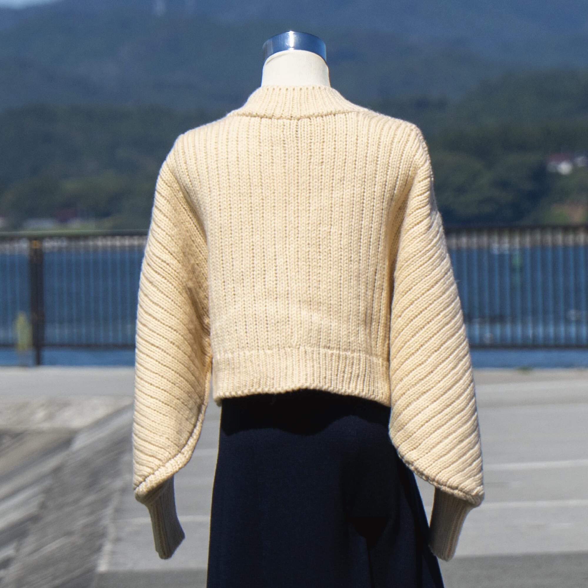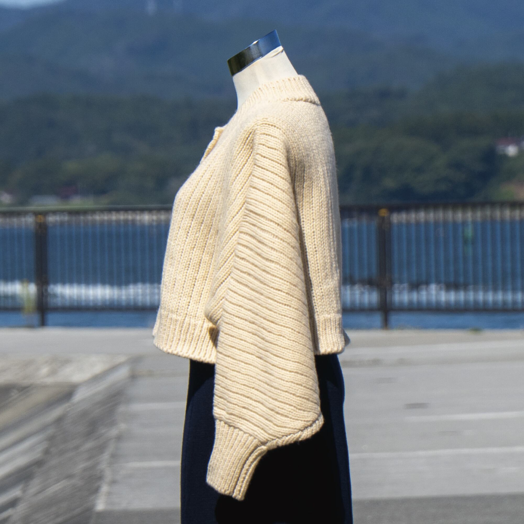 手編み用の極太ウールを使って、編み地を張り抜きにすることで重すぎず、伸縮性を実現しました。ふわっとした着心地になるように洗い加工を入れました。着心地の良い柔らかニットです。