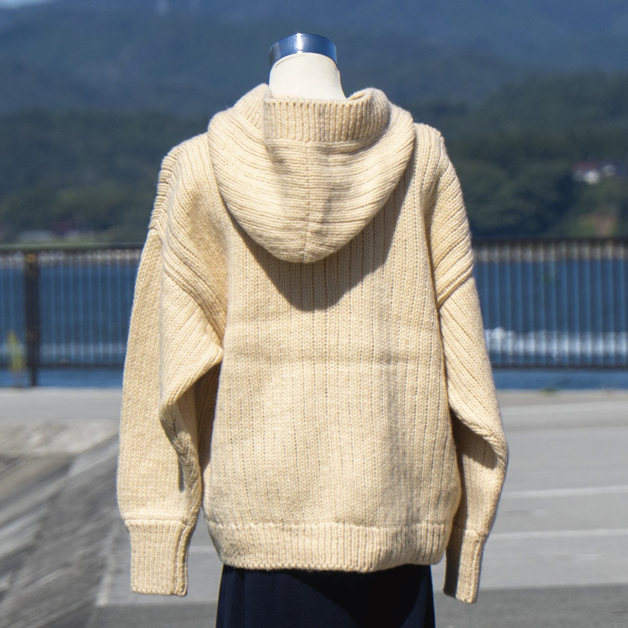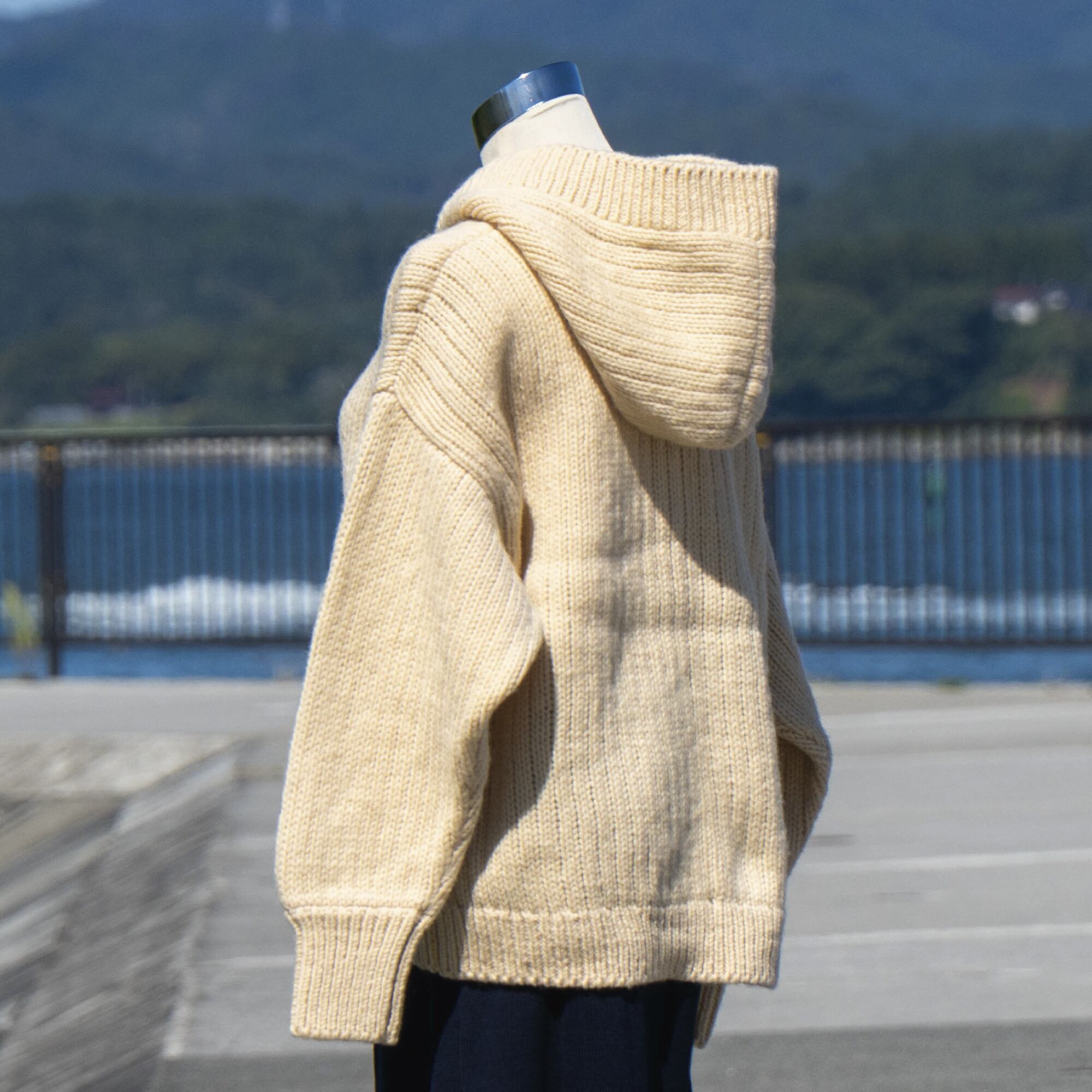 手編み用の極太ウールを使って、編み地を張り抜きにすることで重すぎず、伸縮性を実現しました。ふわっとした着心地になるように洗い加工を入れました。着心地の良い柔らかニットです。